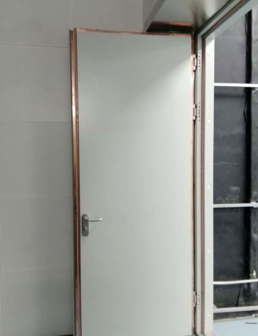 门扇双台阶结构镶嵌两道铜片和一道密封条,门框镶嵌一道铜片和一道密封条,组成多层屏蔽结构,满足屏蔽电磁信号的需求。